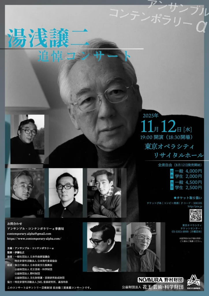 NPO法人JML音楽研究所では、2025年11月12日 (水)に行われる湯浅譲二追悼コンサート(アンサンブル・コンテンポラリーα主催)に協力金事業として協力しています。